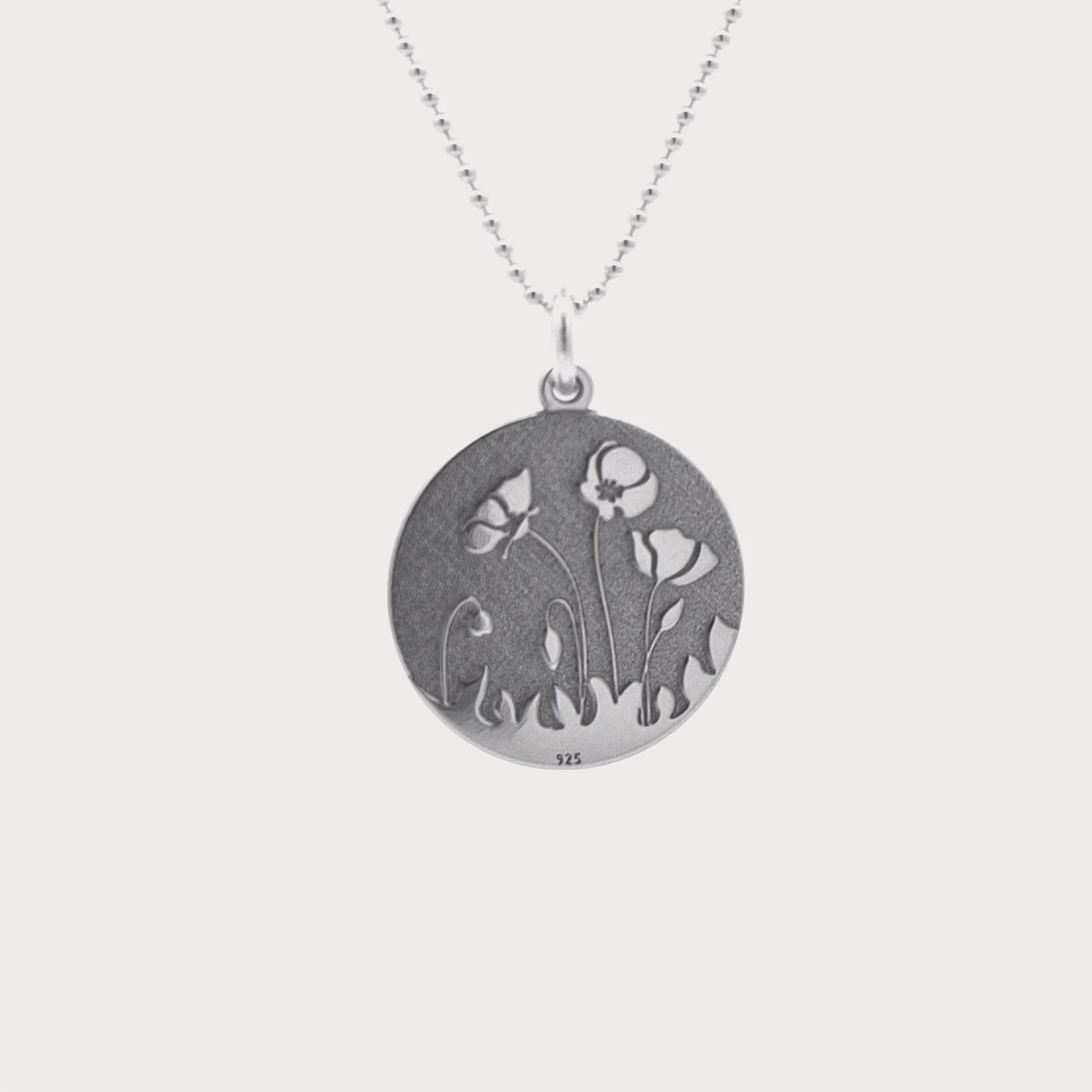Engraved Poppy Disc Pendant Necklace in Sterling Silver
