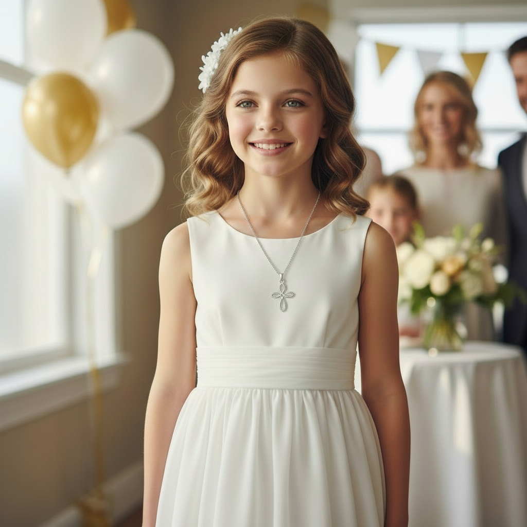 Celebrate the special milestone of a Communion or Confirmation with our stunning Irish Infinity Cross Silver Necklace. This elegant piece of silver jewelry features two intricately intertwined infinity symbols that form the classic shape of a Celtic cross. Irish Infinity Cross Celtic Necklace is a meaningful and symbolic way to commemorate these special occasions.