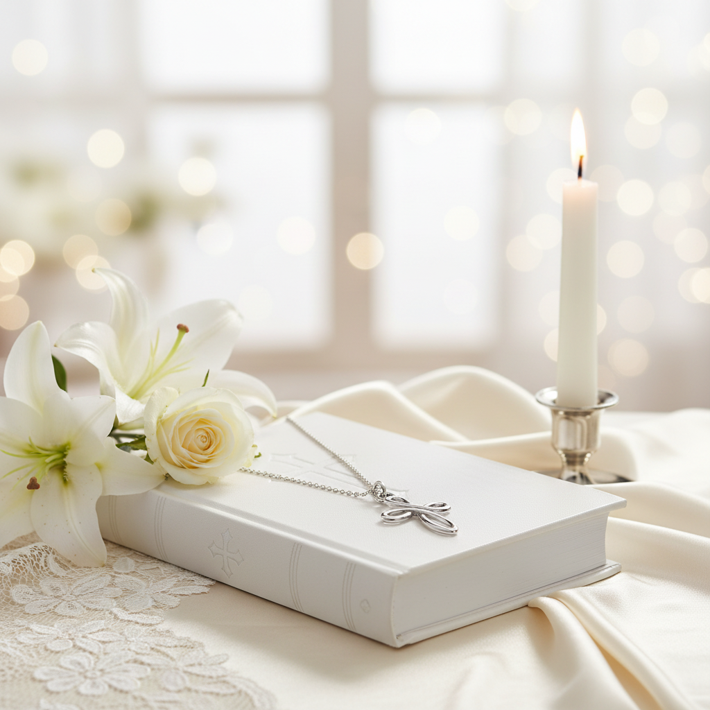 The infinity symbol represents the eternal bond of love and devotion, while the cross symbolizes faith and redemption. Together, they create a powerful and symbolic statement that is perfect for Communion or Confirmation gifts.