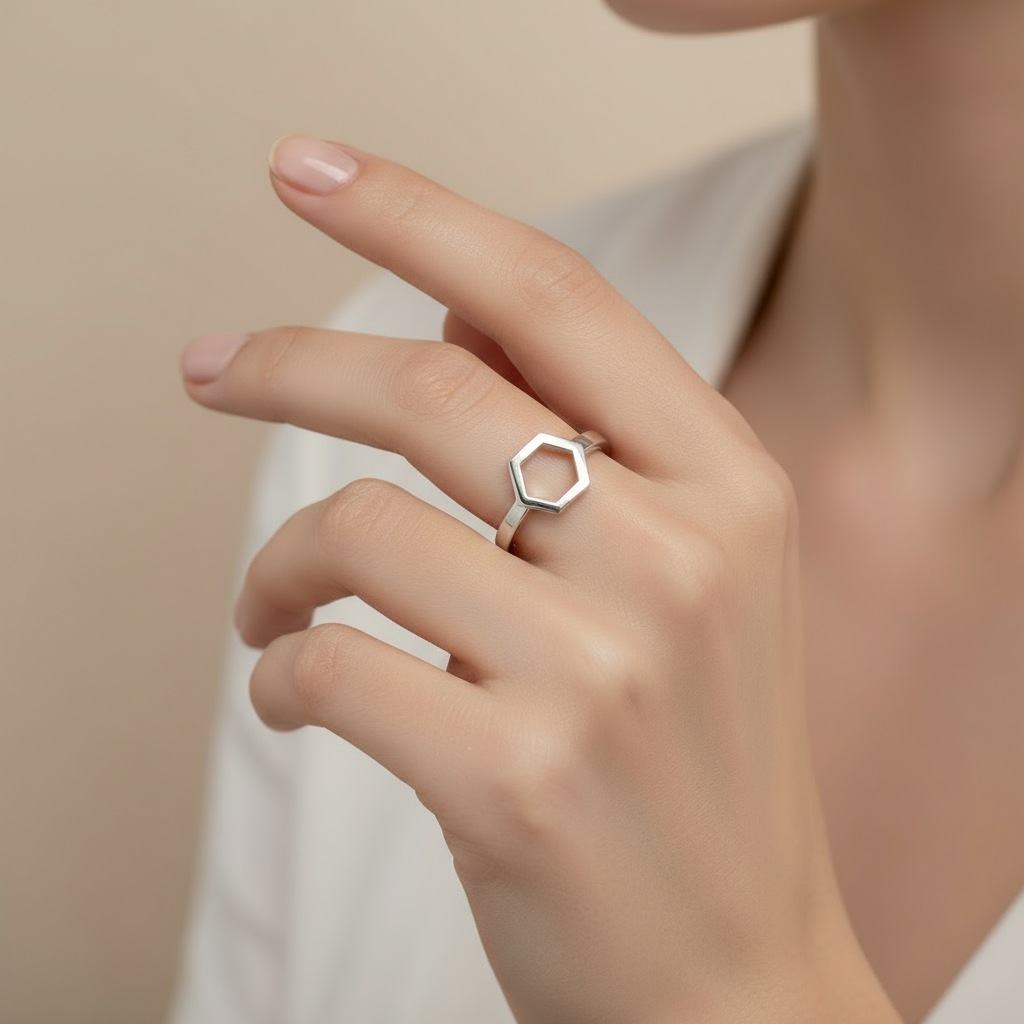 The centrepiece of this silver ring is a meticulously detailed hexagon design, symbolizing the structure of a honeycomb or a hexagon molecule. This representation is not only a nod to the geometric marvels of nature but also to the smallest fundamental units of chemical compounds. The high-quality, nickel-free 925 Sterling Silver ensures durability and a brilliant shine, making this silver ring a timeless addition to your accessories.
